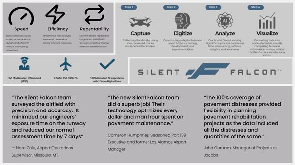 Silent Falcon is focused on delivering powerful, precision-driven data analytics solutions that create measurable value across industries. By leveraging cutting-edge technology—including high-resolution digital twins, AI-powered analysis, and intuitive visualization tools—Silent Falcon empowers customers including airports with actionable insights that drive proactive maintenance, budget planning, and long-term asset management.